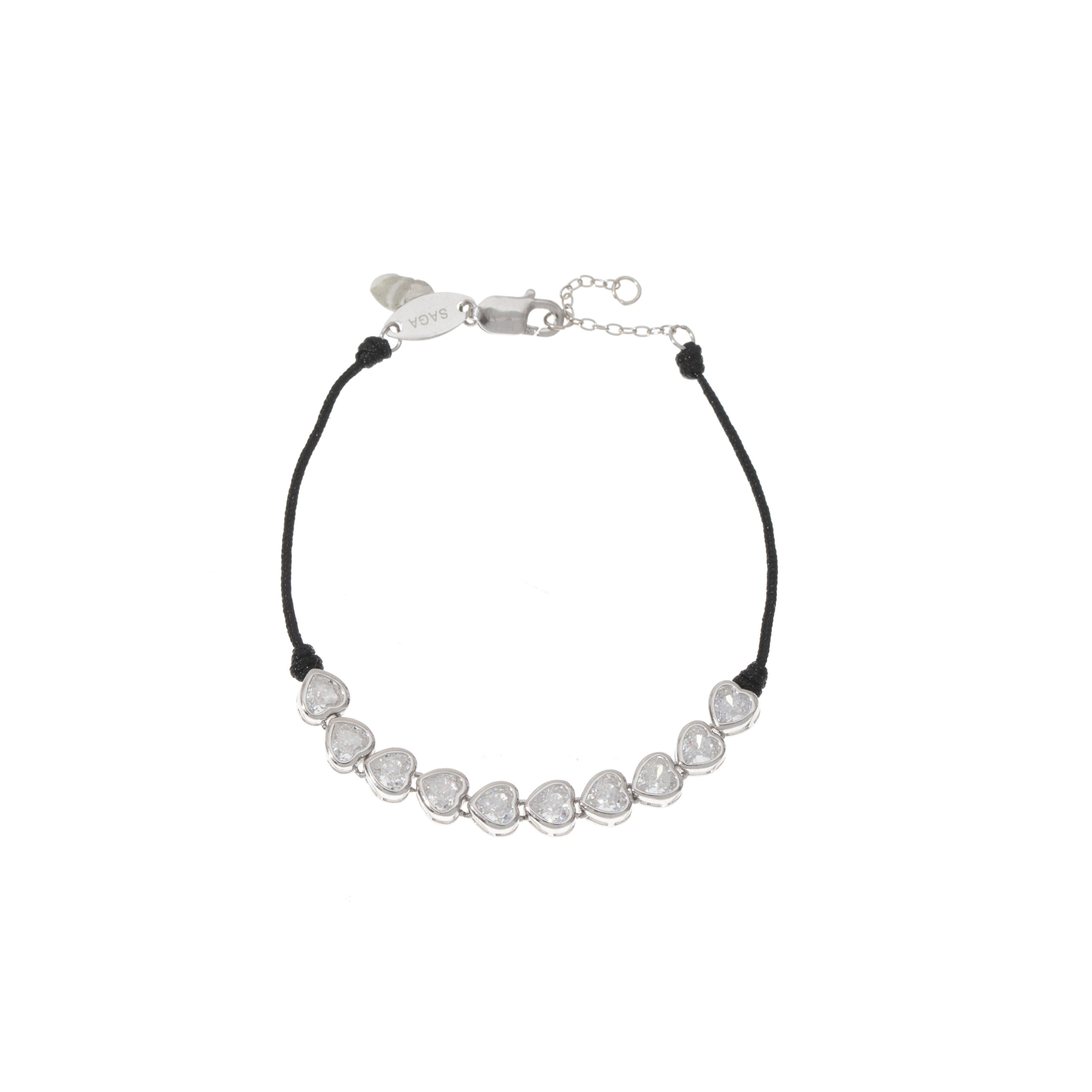 צמיד זרקוני לבבות כסף 925 משולב חוט משי שחור מצדדיו נסגר עי קרבינה כסף 925 ושרשרת הארכה וחותמת המותג ניתן להתקלח