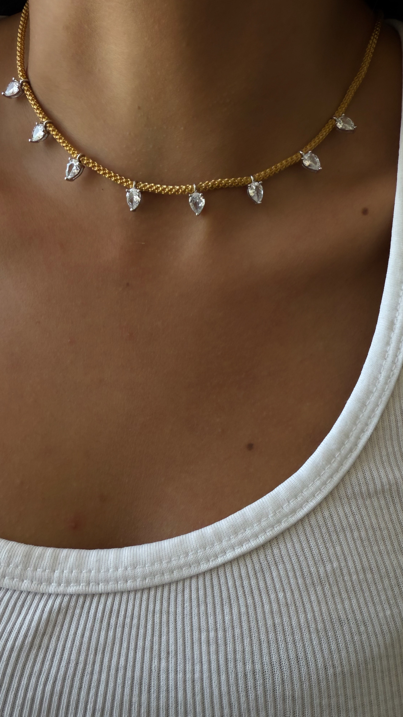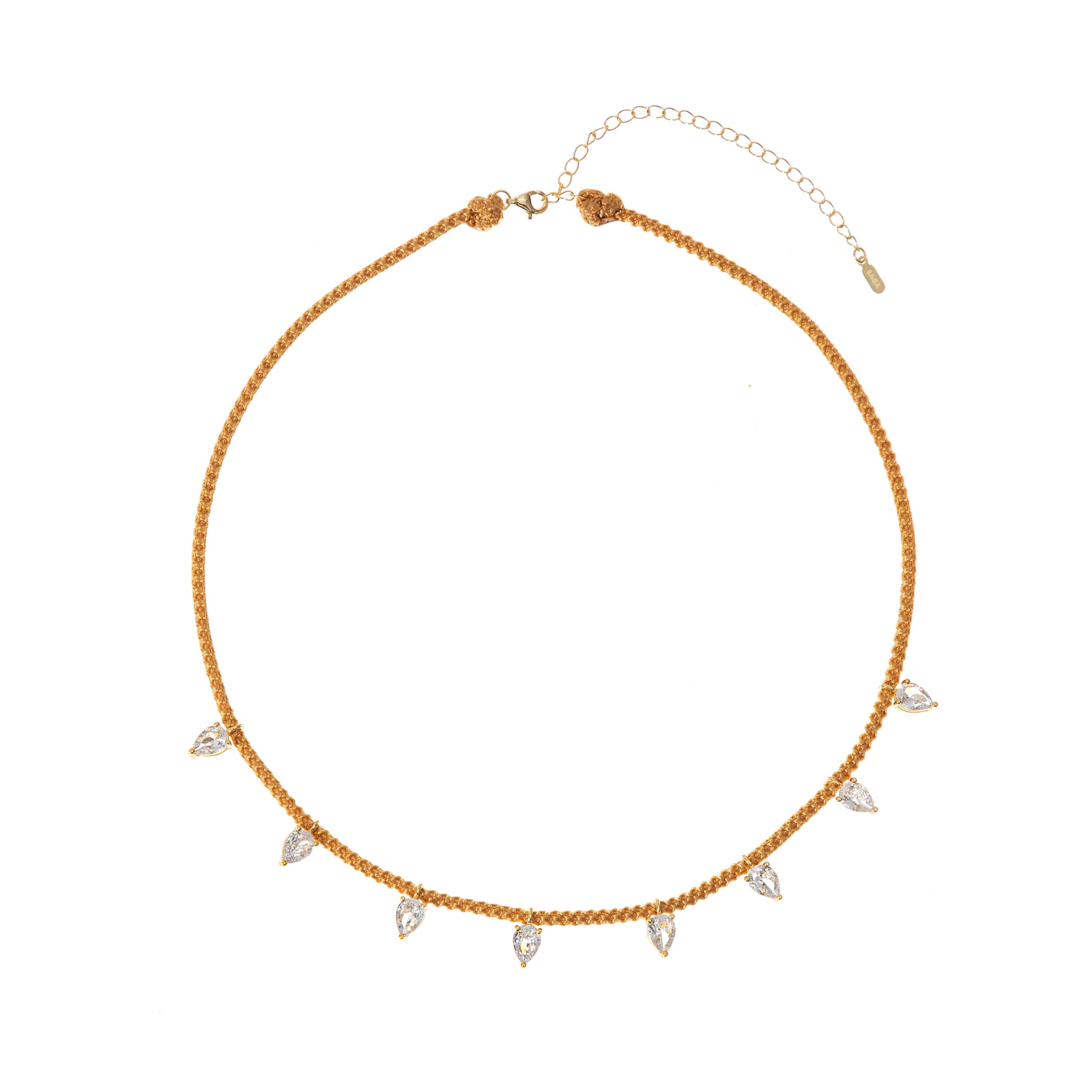 שרשרת קלאסית , טיימלס ניתן להרטיב על בסיס חוט שזירה בז ברוחב 2 מ״מ עמידה במים משולבים זרקוני טיפה בגודל 5/7 כסף 925 , קיים בזהב מקרון אורך השרשרת 40 ס״מ בתוספת הארכה כסף 925 חתום סאגא