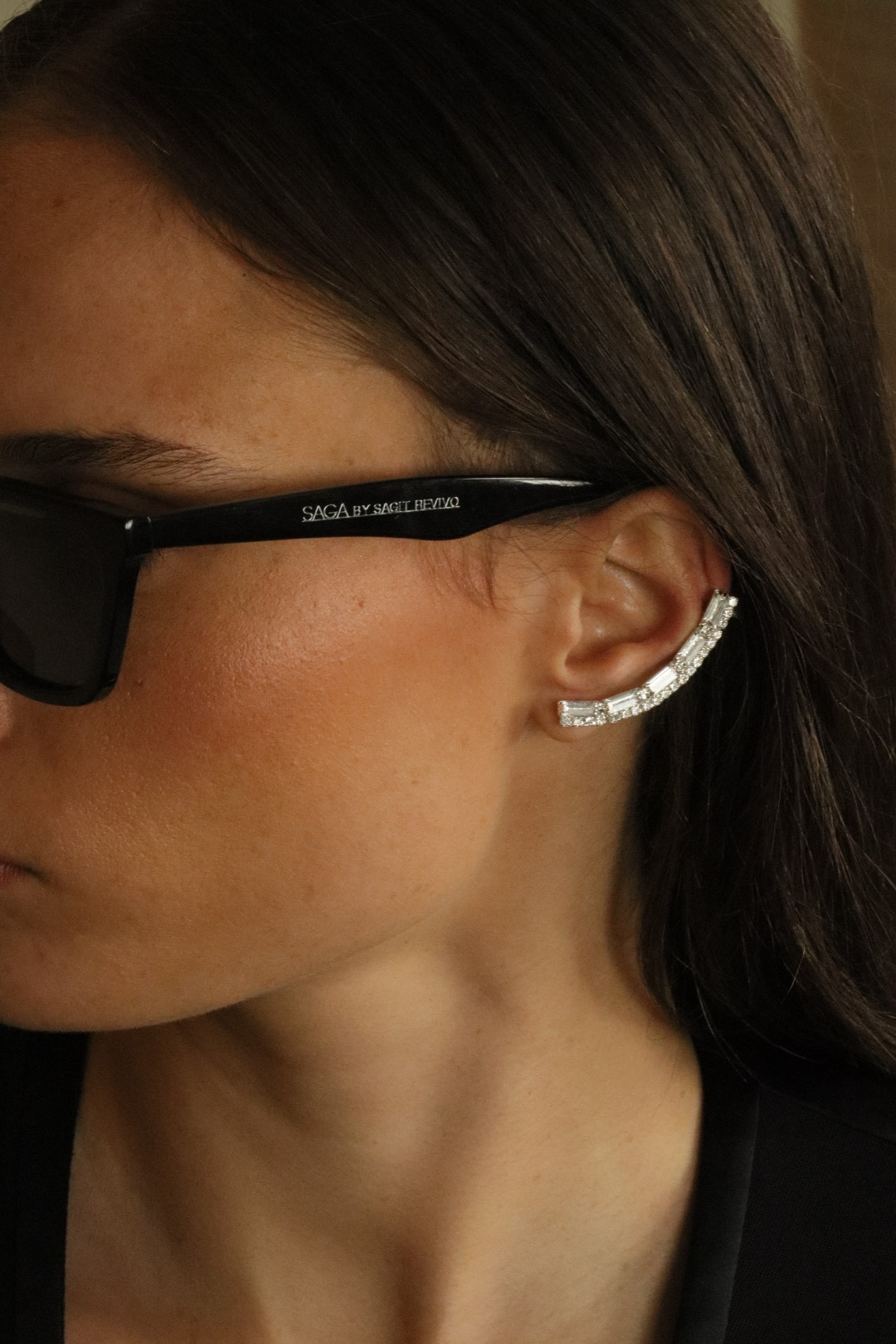 עגיל מטפס משובץ קריסטלים בתוספת עגיל צמוד לאוזן הנוספת העגיל המטפס בנוי בחלקו התחתון ע"י מוט דוקרן ובחלקו העליון קליפס בורג ללא צורך בחור קיים צד שמאל או ימין כעגיל מטפס