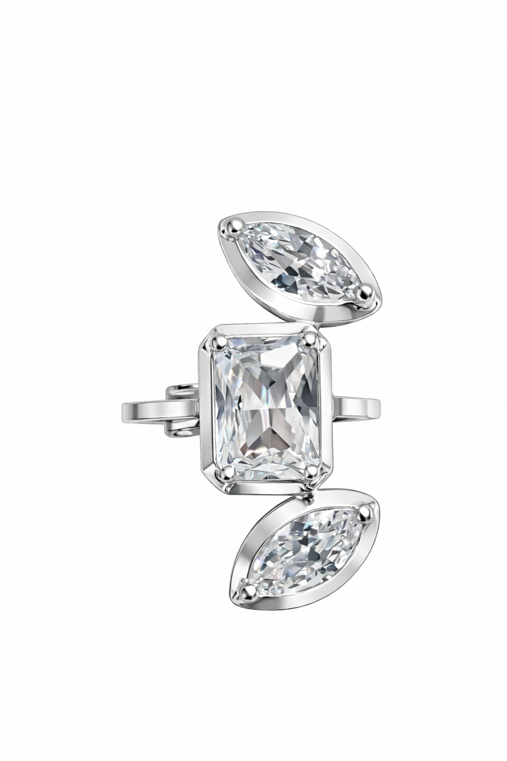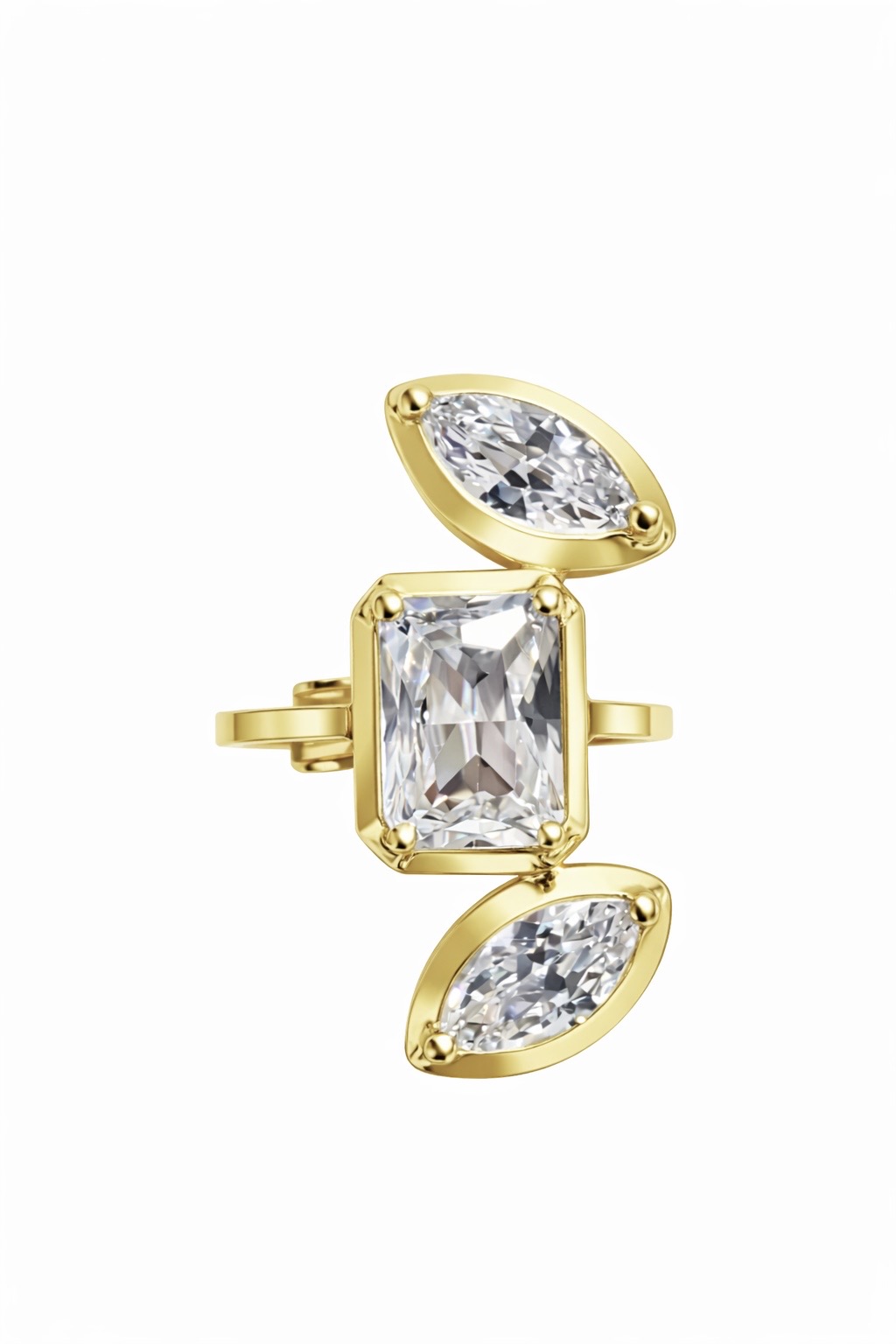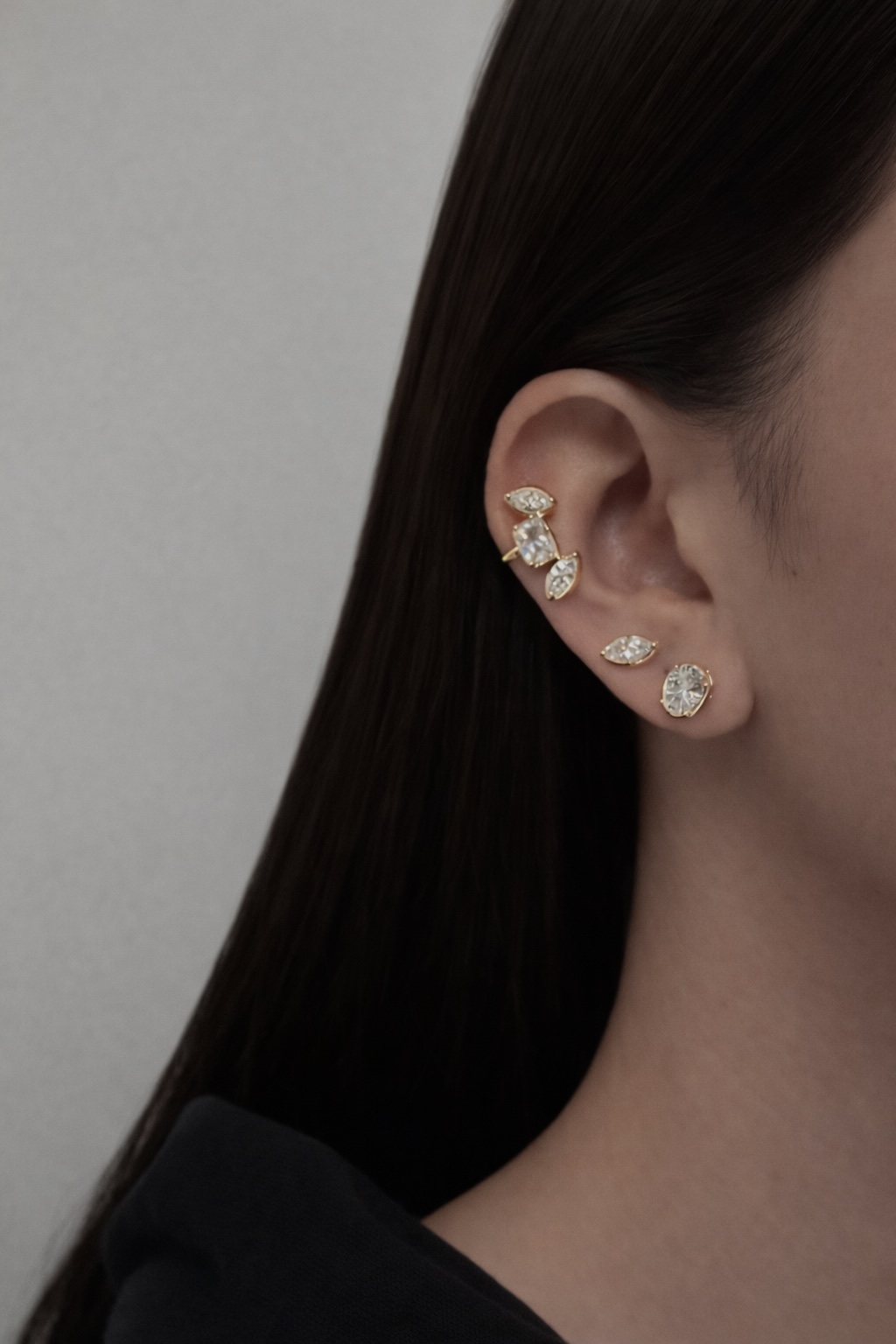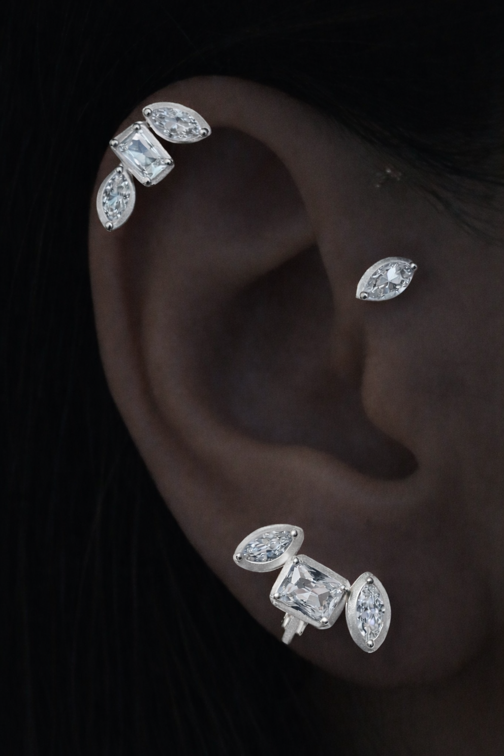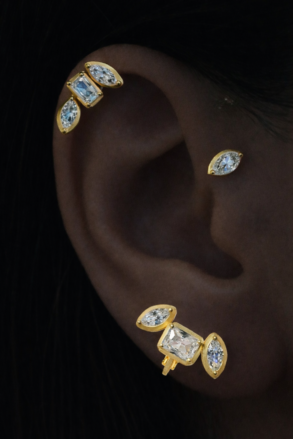 עגיל מטפס מושלם על בסיס בורג קליפס ללא צורך בחור משולב אבן מרכזית מלבנית ומרקיזות מכל צד אורך העגיל 2.1 ס״מ ניתן לענוד בחלק העליון של האוזן או התחתון